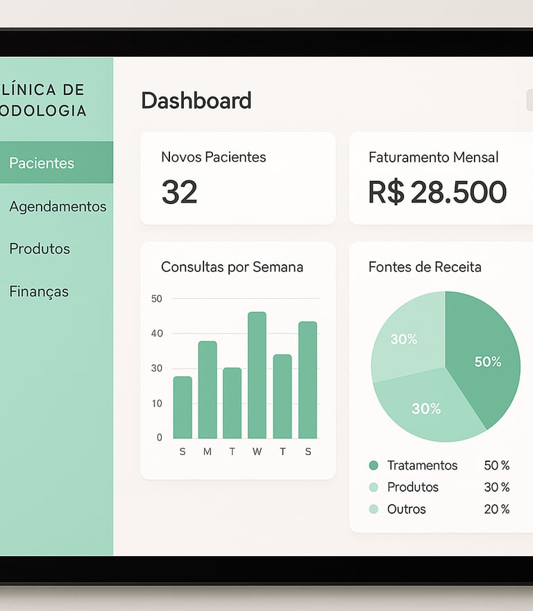 Registre pacientes, consultas, produtos e finanças em uma única ferramenta. Inclui um painel, gráficos automáticos e botões de navegação.